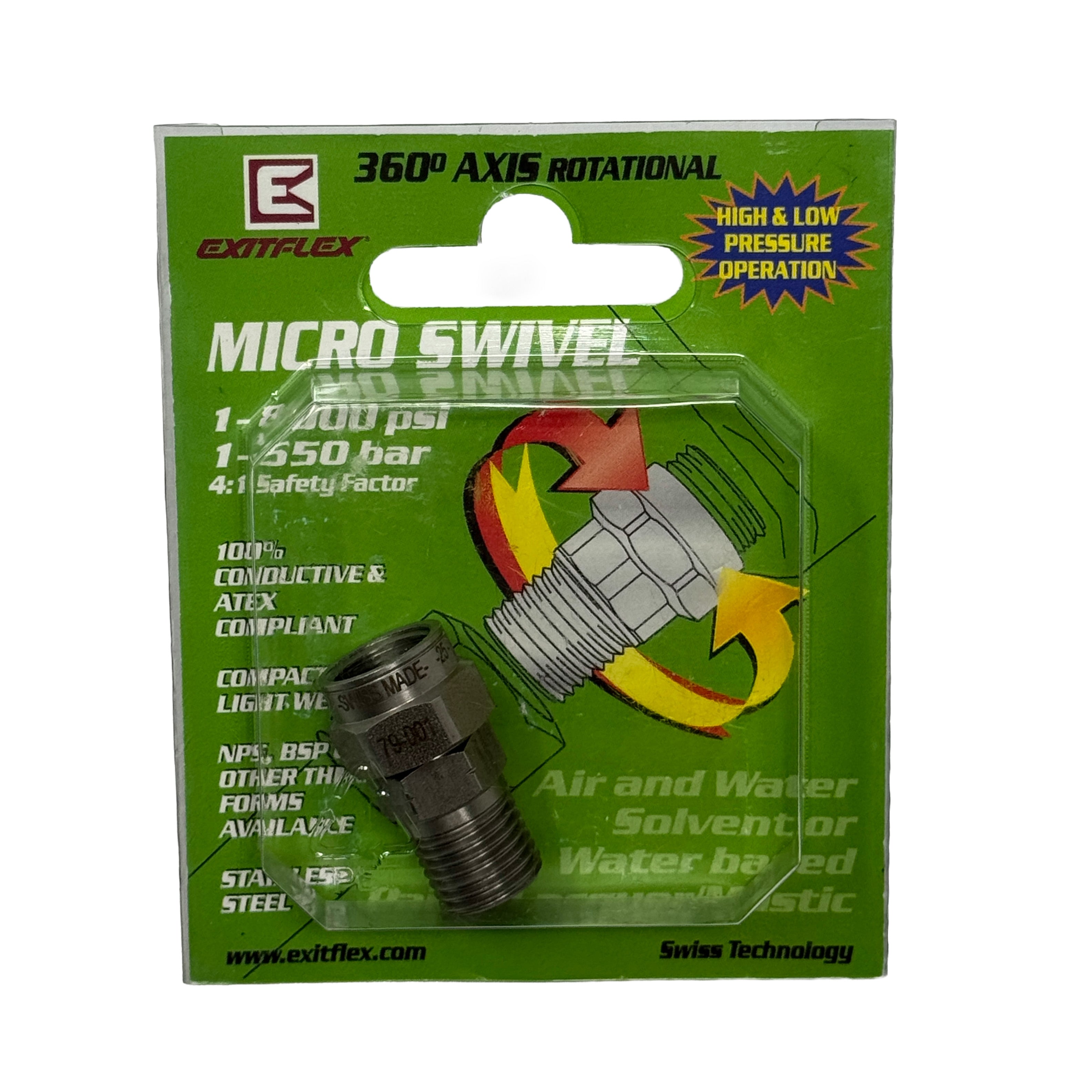 ExitFlex Swiss Made Straight Swivel for airless spraying. The perfect accessory to your airless hose whip. Make your whip more flexible, easier to twist and maneuver. Help eliminate arm and wrist fatigue. Comes as one swivel per pack.
